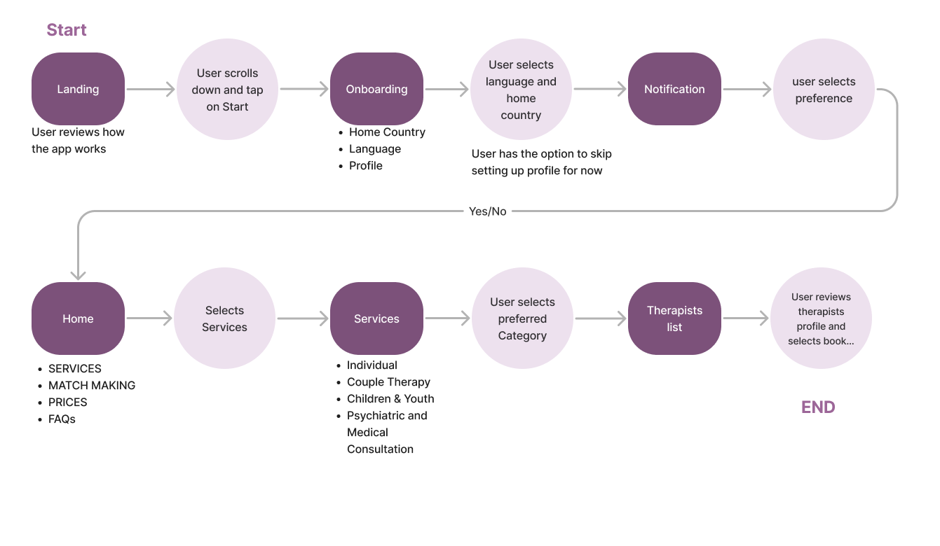 This user flow prioritizes a seamless onboarding experience to address users’ needs. Users can easily select their home country to ensure therapist recommendations are tailored to their cultural background. Subsequently, choosing their preferred language fosters a comfortable and familiar environment during therapy. Finally, with convenient in-platform appointment booking, users can swiftly connect with the right therapist for their unique needs addressing our HMW.